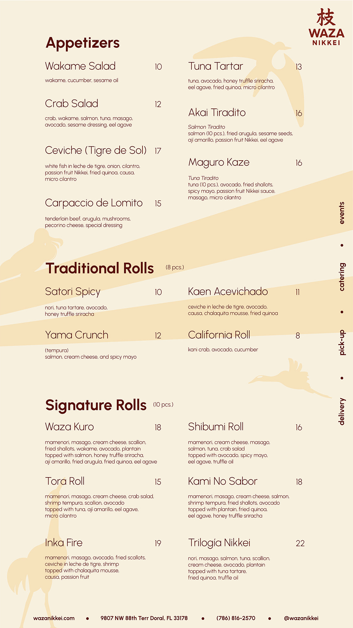 Waza Nikkei is a newly launched restaurant offering Japanese–Peruvian cuisine for delivery, pickup, catering, and private events. With no prior brand assets, my role was to develop a complete visual identity that felt modern, fresh, and approachable, while honoring the dual traditions of Nikkei cuisine.